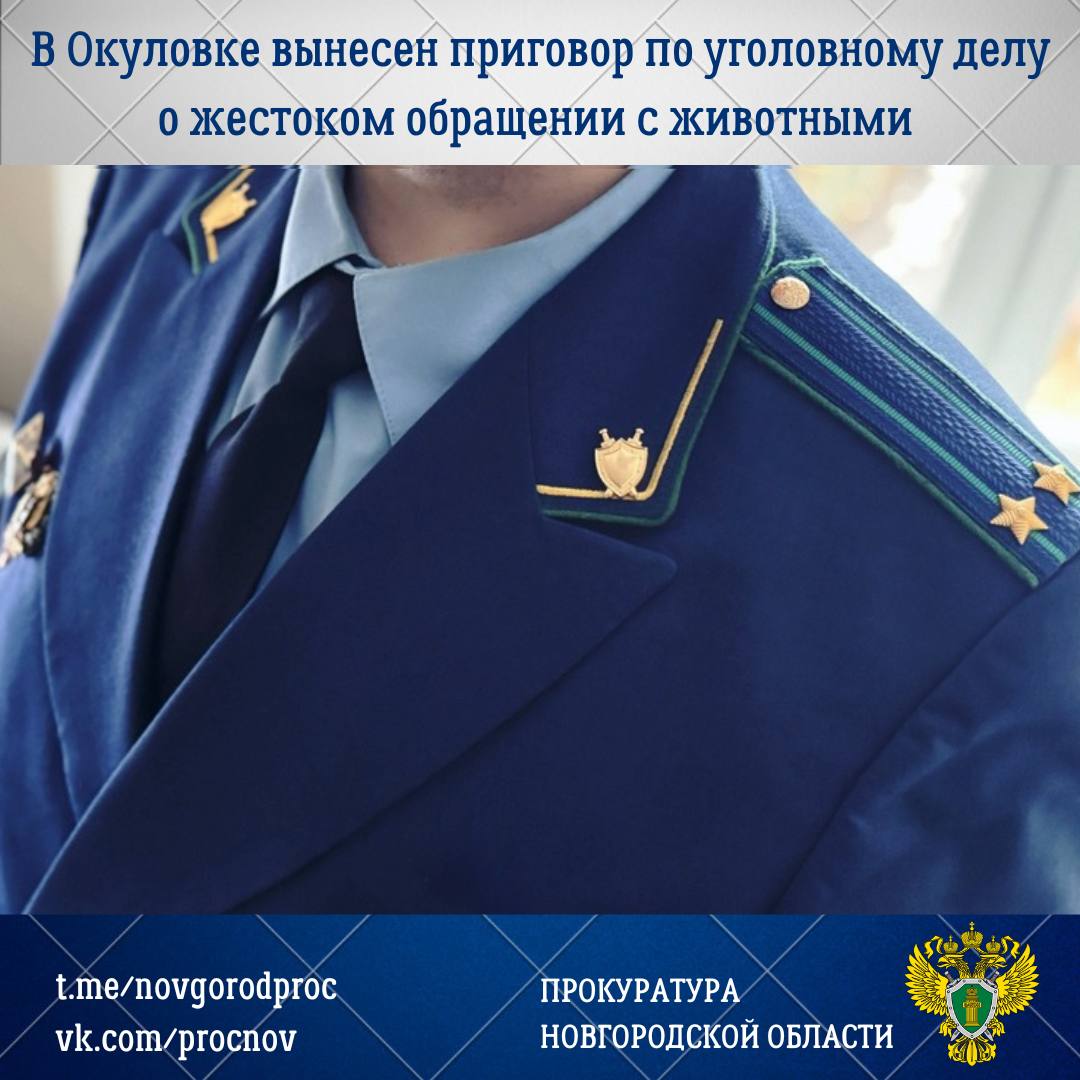 Мировой судья судебного участка № 16 Окуловского судебного района с участием представителя прокуратуры Окуловского района вынес обвинительный приговор по уголовному делу в отношении 41-летнего местного жителя Андрея Долганова. Он признан виновным в совершении преступления по ч. 1 ст. 245 УК РФ (жестокое обращение с животным в целях причинения ему боли и страданий, повлекшее его гибель).