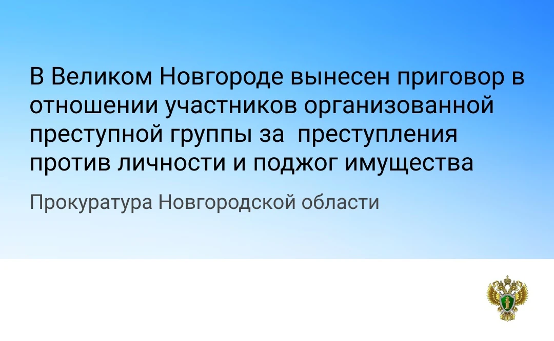 Новгородский районный суд с участием группы государственных обвинителей прокуратуры Новгородской области вынес обвинительный приговор по уголовному делу в отношении 33-летнего жителя областной столицы Гаврилова Руслана и 26-летнего жителя Новгородского района Иванова Руслана. Они признаны виновными в совершении в составе организованной преступной группы двух преступлений по ч. 2 ст. 167 УК РФ (умышленное уничтожение чужого имущества с причинением значительного ущерба гражданину, путем поджога), ч. 1 ст. 115 УК РФ (умышленное причинение легкого вреда здоровью), п. «г» ч. 2 ст. 112 УК РФ (умышленное причинение средней тяжести вреда здоровью, совершенное организованной группой) и ч. 2 ст. 116.1 УК РФ (нанесение побоев, лицом, имеющим судимость за преступление, совершенное с применением насилия).