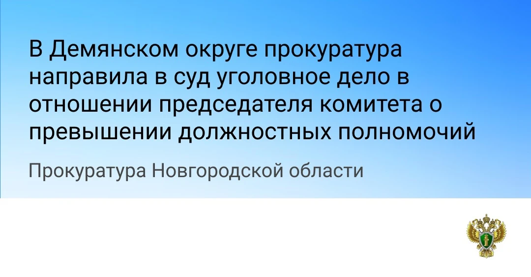 Прокуратура Демянского района направила в суд уголовное дело в отношении председателя комитета по образованию Администрации Демянского муниципального округа. Он обвиняется в совершении преступления по п.п. «д», «е» ч. 3 ст. 286 УК РФ (превышение должностных полномочий).