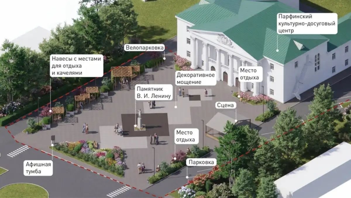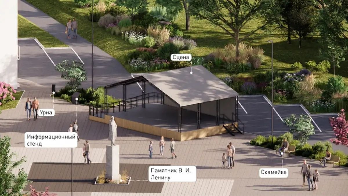 На площади предлагают создать комфортные условия для праздников, отдыха и встреч, обновив покрытие на площади, отделив пешеходное пространство от проезжей части и заменив сцену. Здесь также планируют установить навесы со скамейками и качелями, высадить декоративные растения, добавить освещение и организовать парковочные места.