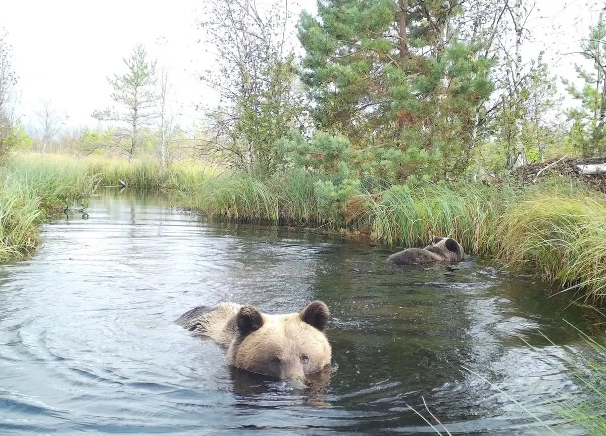 Фотоловушка запечатлела банные процедуры новгородской медведицы с медвежатами