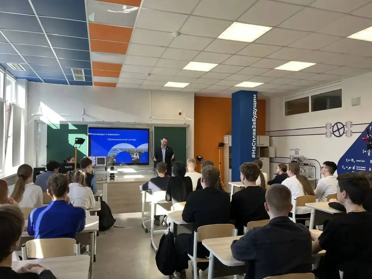 В школе № 36 имени Г.Р. Державина министр промышленности и торговли Новгородской области Иван Чекмарев провёл урок «Разговоры о важном» для учеников девятых классов. Темой стали современные российские заводы.