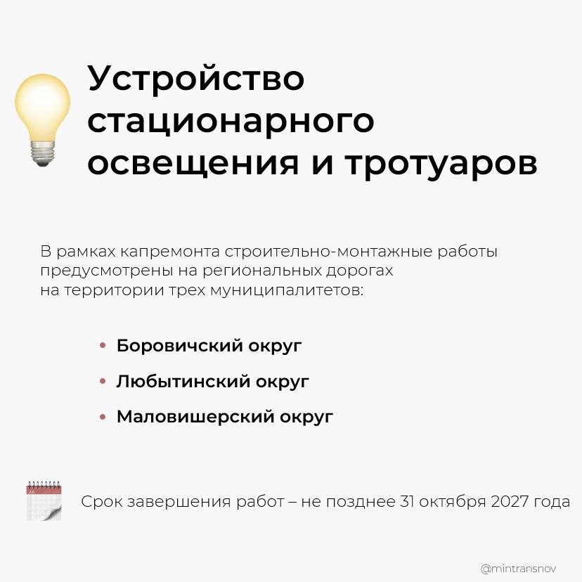 На шести участках региональных дорог Новгородской области до конца 2027 года появятся наружное освещение и тротуары.Уже определен подрядчик и заключен контракт на капремонт в трех округах: Боровичском, Любытинском и Маловишерском, сообщает...