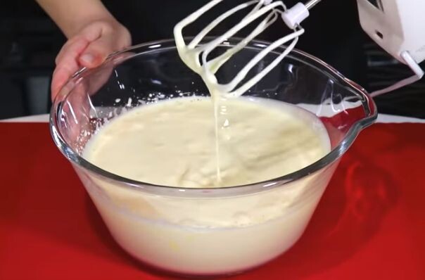 2. Затем аккуратно добавляют теплое молоко и размягченное сливочное масло, продолжают смешивать на низкой скорости. В отдельной таре соединяют муку с разрыхлителем и постепенно вводят в тесто.