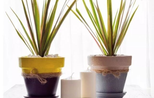 Этот метод идеален для тех, кто всегда спешит, но не хочет расставаться с любимым хобби. Всего за 20 минут можно преобразить горшки с минимальными затратами. Для этого понадобятся всего лишь скотч, старая газета, шпагат, две акриловые краски разных оттенков и лак.
