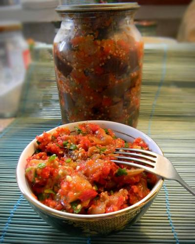 Смешайте баклажаны с перцево-чесночной смесью. Мелко нарежьте зелень, добавьте уксус и подсолнечное масло. Не забудьте попробовать на вкус и, если необходимо, досолите блюдо. Если салат планируется заготовить на зиму, то необходимо стерилизовать банки и укутывать их до полного охлаждения. В случае же, если салат подаётся к столу сразу, его стоит оставить в холодильнике на 5-10 часов. Этот салат не только вкусен, но и может помочь в борьбе с вирусами в холодное время года.