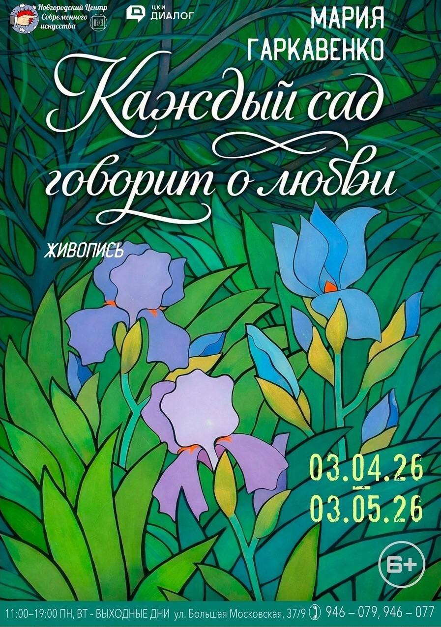 Гостья из Санкт-Петербурга и постоянный резидент музея современного искусства «Эрарта» Мария Гаркавенко презентует свою выставку «Каждый сад говорит о любви». Художница покажет новгородцам картины, разговаривающие со зрителем на своём неповторимом художественном языке, тем самым представляя новое поколение художников России.