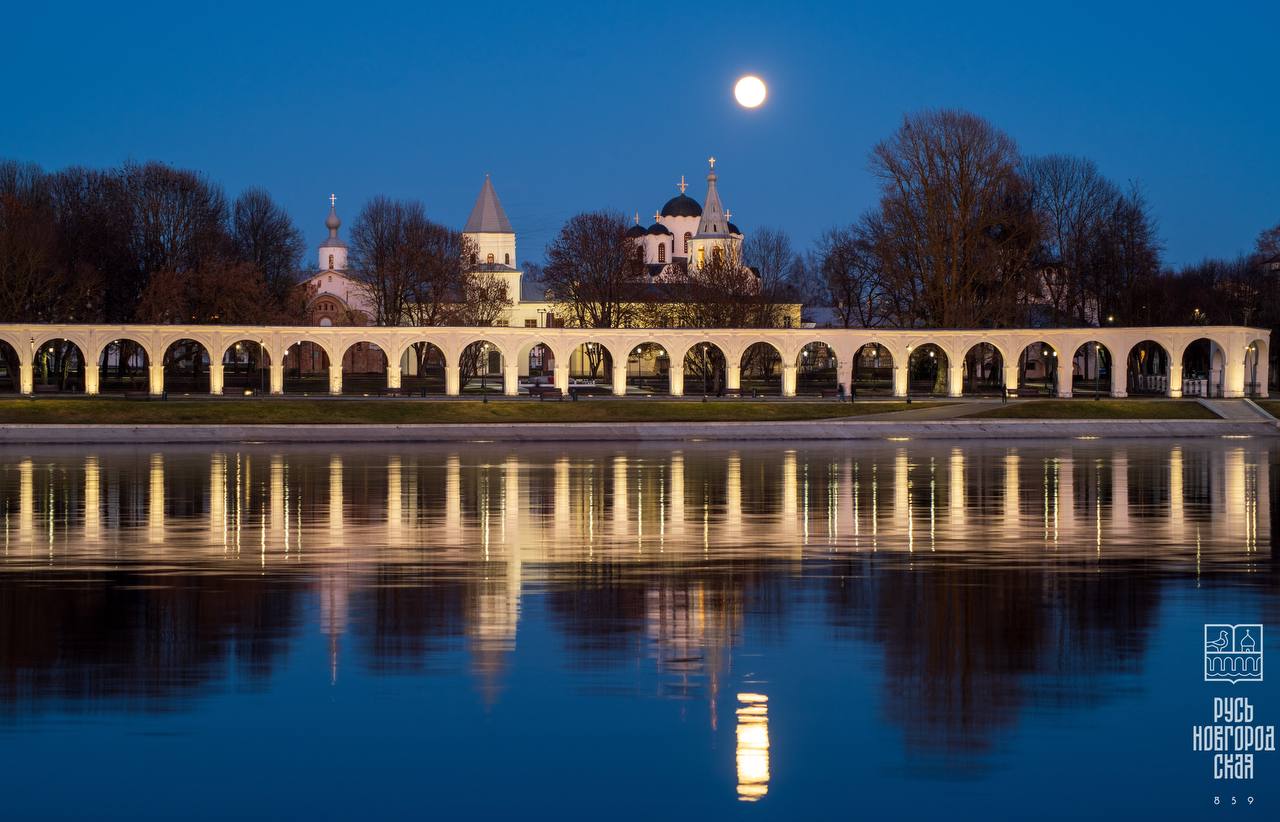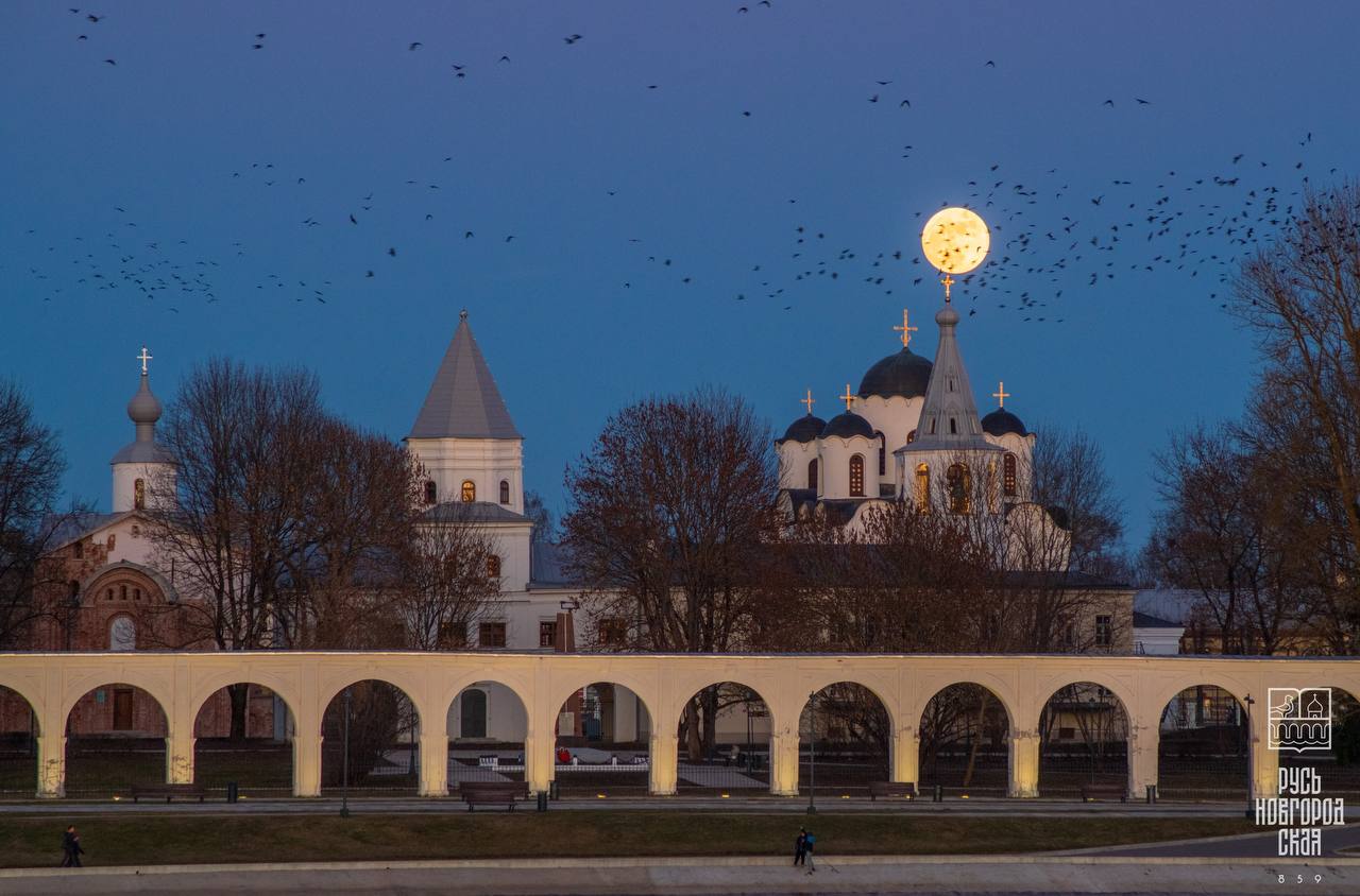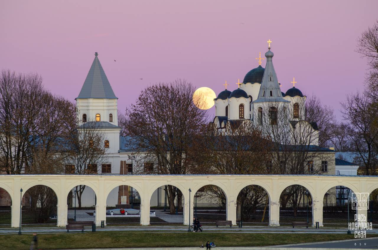 Восход полной луны над Никольским собором в Великом Новгороде.