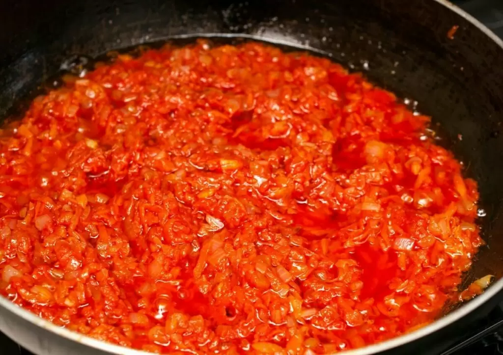 Фасоль рекомендуется замочить на ночь, а затем отварить до полной готовности. На сковороде растопить столовую ложку масла и обжарить лук вместе с морковью, пока они не станут мягкими. Добавить томатную пасту и продолжить обжаривать в течение еще нескольких минут.