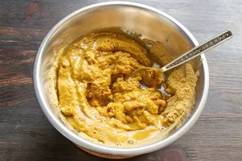 3. Горячий рассол осторожно выливается в горчичный порошок, после чего смесь тщательно перемешивается до получения однородной консистенции.