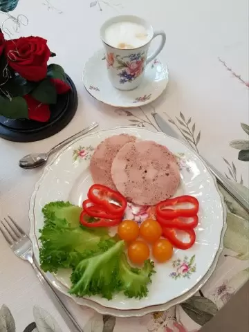 9. Вынуть ветчину из пакета и нарезать ломтиками. Подача с листьями салата, свежим перцем и помидорами черри придаст блюду завершенный вид.