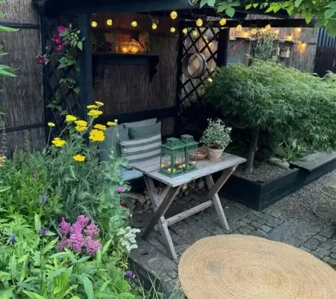 Этот великолепный уголок располагается между двумя пышными клумбами, и к нему ведет мощеная дорожка. Перед деревянным столом, оформленным в деревенском стиле, простирается уютный коврик, создающий домашнюю атмосферу. Поддержка в виде перголы с металлическим покрытием обеспечивает тень и абсолютный комфорт. Гирлянды, фонари и солнечные свечи добавляют волшебства, делая этот уголок идеальным для вечерних посиделок.