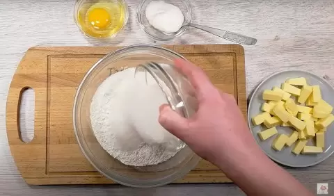 Сначала в миске соединяются мука, соль, сахар и разрыхлитель. Затем добавляется масло, которое нужно перетереть с мукой до получения крошки. В последнюю очередь следует добавить яйцо и сметану, быстро замесить тесто, которое должно получиться мягким и однородным.