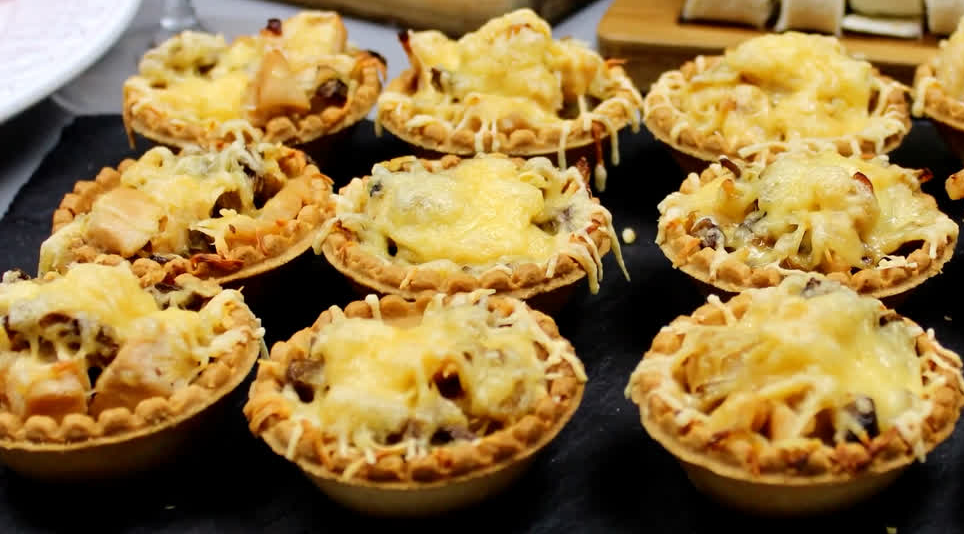 4. Смешайте курицу, лук, грибы и соус, затем заполните тарталетки получившейся смесью и посыпьте тертым сыром.