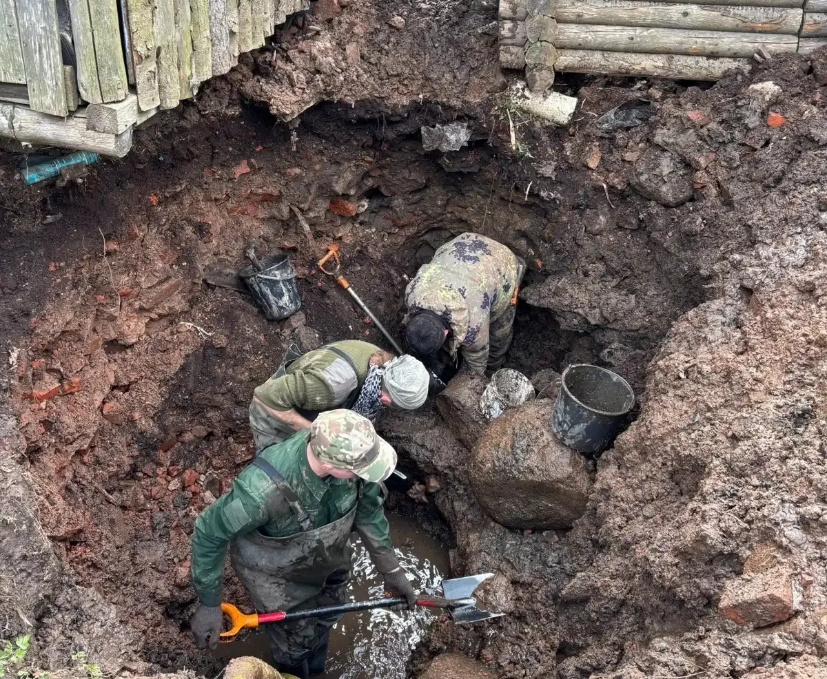В Холме поисковики местного отряда «Пирамида» ведут эксгумацию останков погибших во время Великой Отечественной войны бойцов Красной Армии на одном из приусадебных участков.